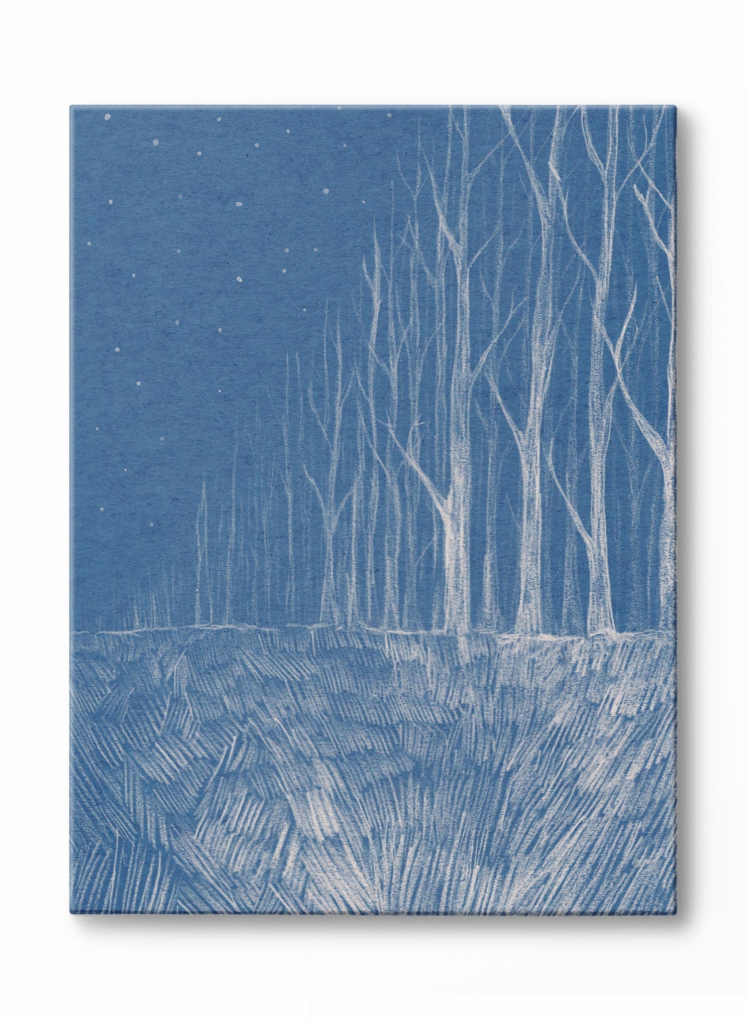 We've visited this place on our latest Dreamwalk. This dreamy and ethereal sketch illustrates grass and trees in a forest in a light color contrasting a deep blue background.
