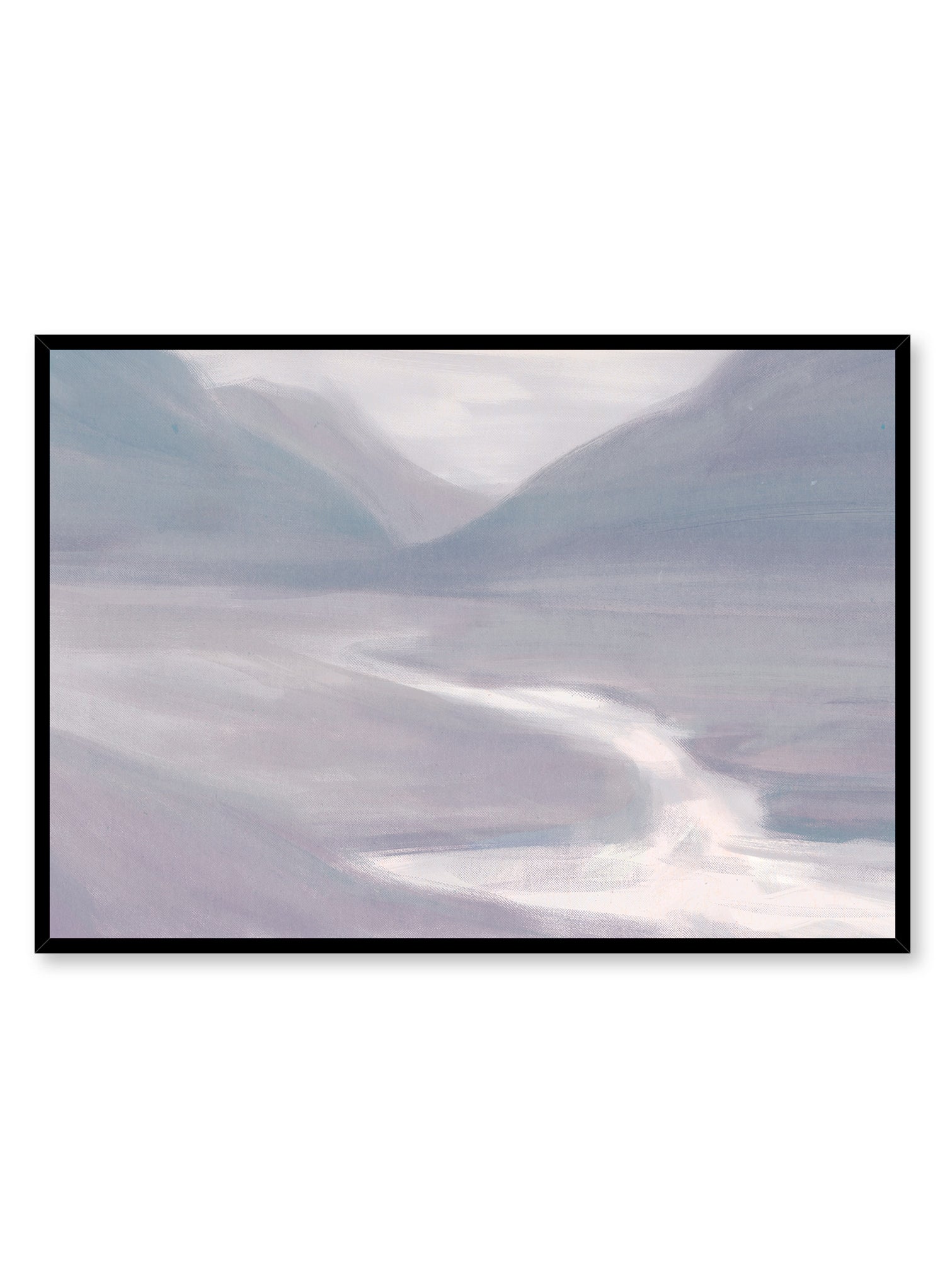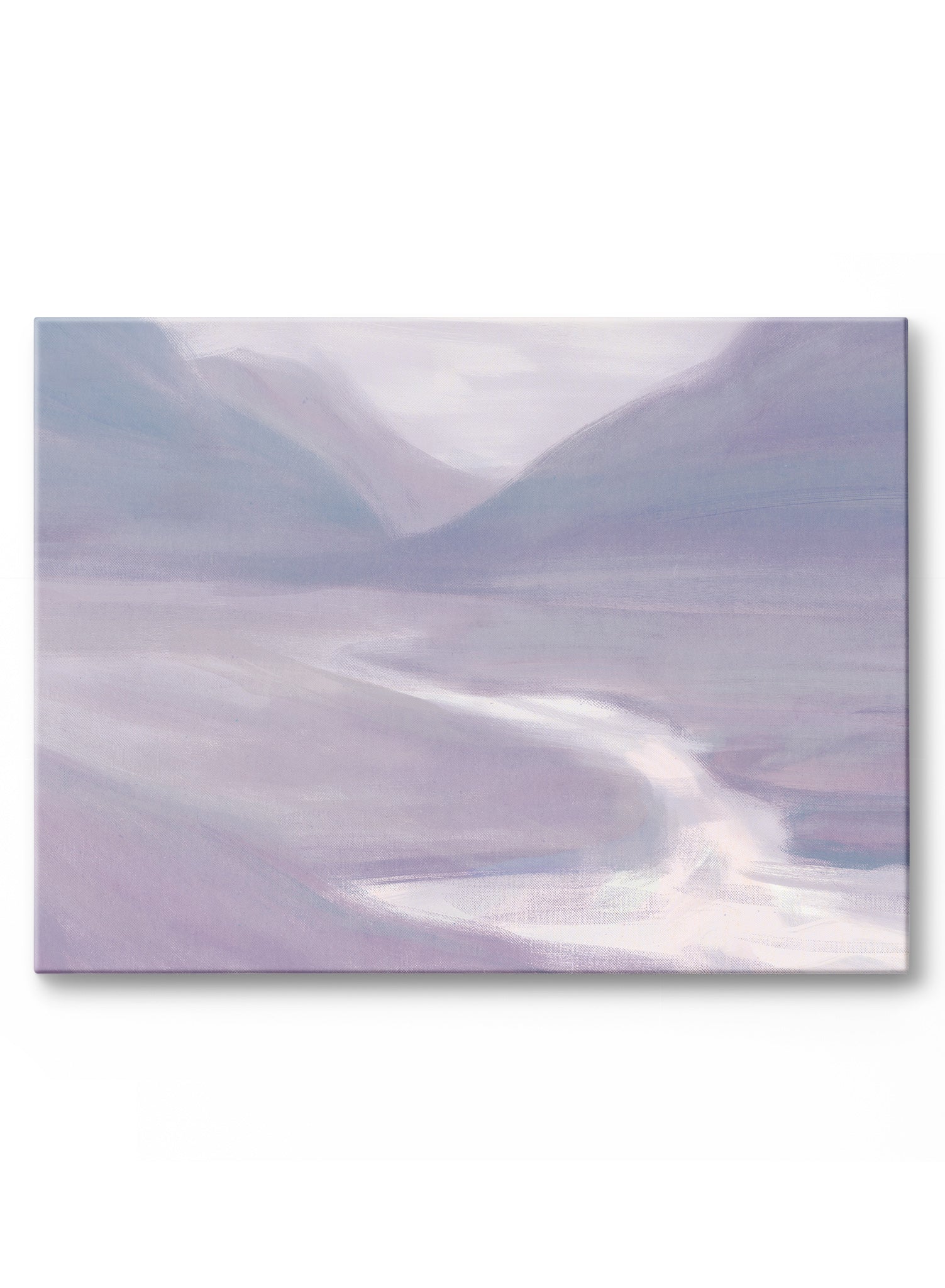 This is where our mind goes to when we manifest zen! Lilac Hills is a stunning purple watercolor landscape composed of a river running at the foot of mountains.